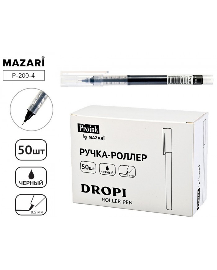 Ручка-роллер DROPI, ЧEРНАЯ, игольчатый пиш.узел 0.5мм, корпус пластиковый прозрачный,