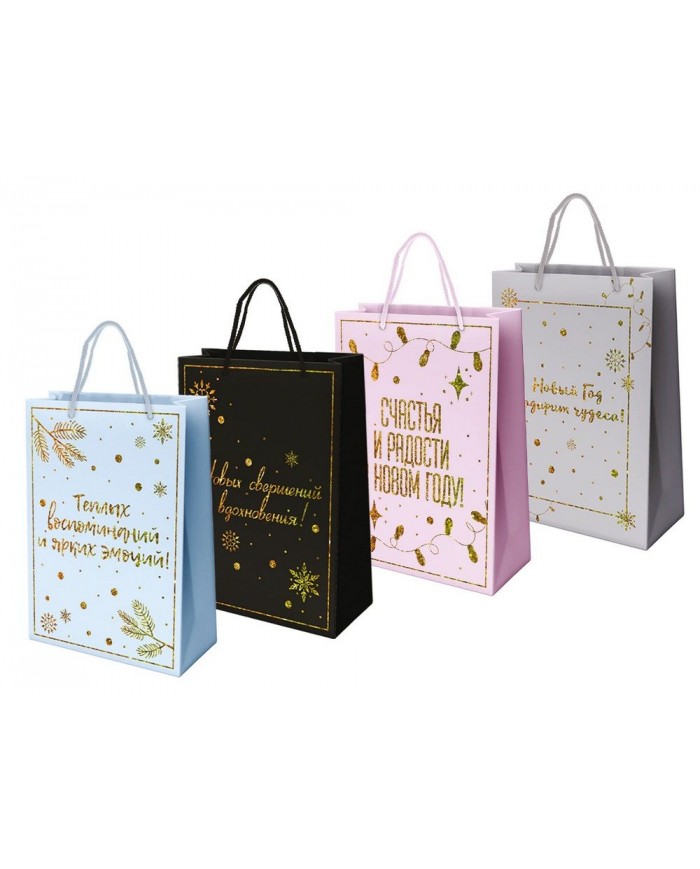 Подарочный пакет новогодний, как и все виды подарочной упаковки, способен придать особый статус подарку. Также он является достаточно практичным изделием, которое может использоваться в повседневной жизни. Пакет изготовлен из мелованной бумаги с матовой ламинацией и с веревочными ручками из полипропилена. Представлен в четырех цветах (ассорти без возможности выбора): пастельный розовый, голубой, серебристый и черный. На каждом пакете написаны новогодние пожелания, что делает пакет частью поздравления. Можно просто вручить его с добрыми словами – и он всё скажет за Вас. Дополнительные элементы декора – маленькие снежинки и звёздочки – создают атмосферу праздника и добавляют каждому пакету особую магию в сочетании с переливающимся голографическим эффектом на всех деталях рисунка. Размер – 33x13x45 см.