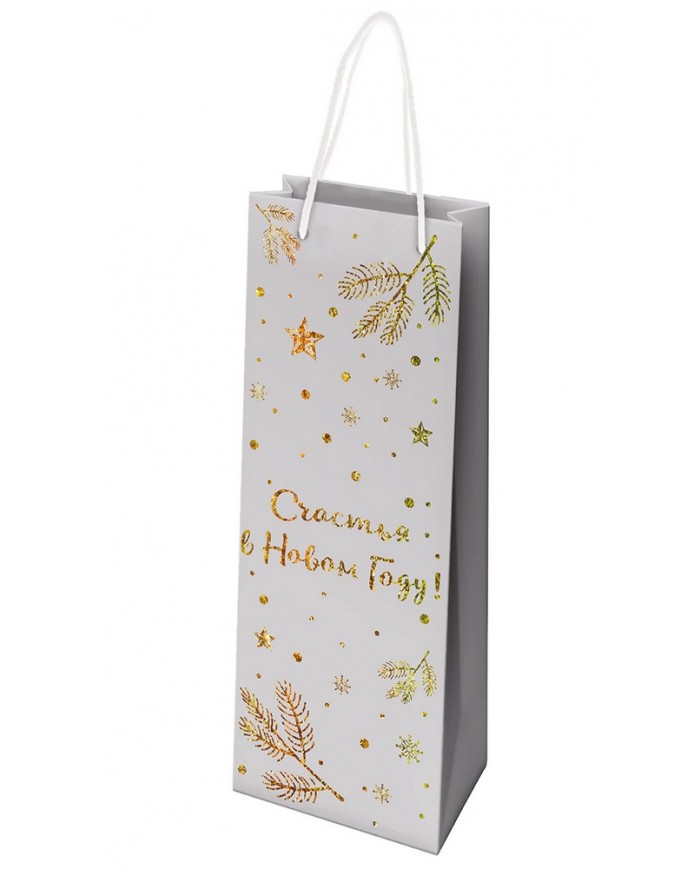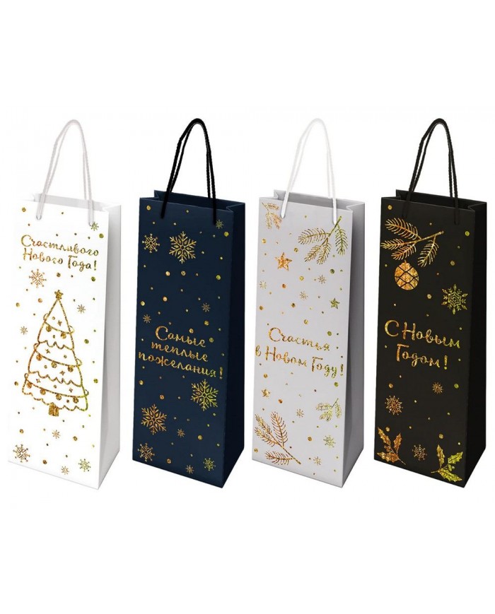 Подарочный пакет новогодний, как и все виды подарочной упаковки, способен придать особый статус подарку. Также он является достаточно практичным изделием, которое может использоваться в повседневной жизни. Пакеты изготовлены из мелованной бумаги с матовой ламинацией и с веревочными ручками из полипропилена. Пакеты представлены в четырех цветах: серебристый, глубокий синий, белый и черный. На каждом пакете написаны новогодние пожелания, что делает пакет частью поздравления. Можно просто вручить его с добрыми словами – и он всё скажет за Вас. Дополнительные элементы декора – маленькие снежинки, звёздочки и веточки – создают атмосферу праздника и добавляют каждому пакету особую магию в сочетании с переливающимся голографическим эффектом на всех деталях рисунка. Размер – 13x9x36 см.