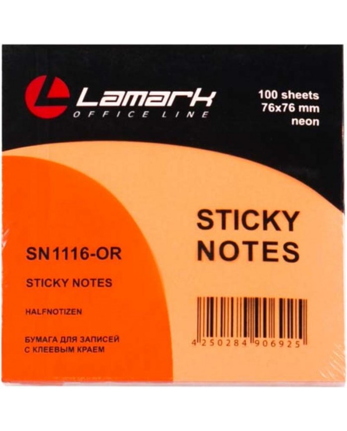 Бумага для заметок Lamark с клеевым краем, цвет оранжевый неон. В блоке 100 листов. Размер 76х76 мм. Листы надежно крепятся на любые поверхности и при удалении не оставляют следов.