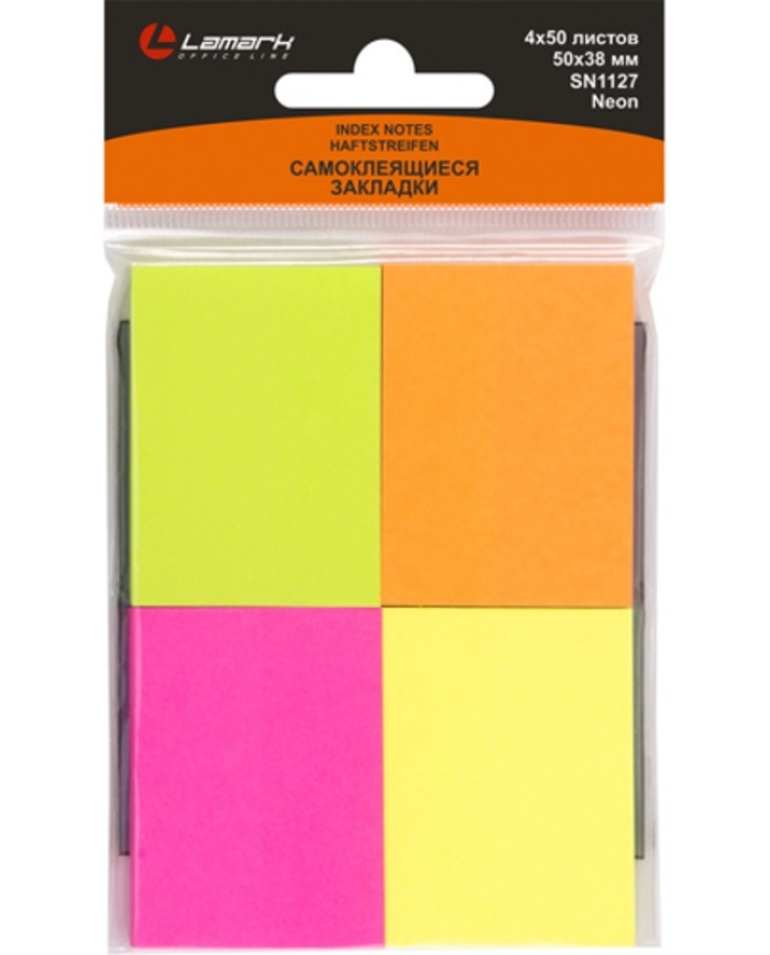 Бумага для заметок с клеевым краем 50x38 мм, 4 цвета по 50 л., неон, бумажные, цена за 4шт
