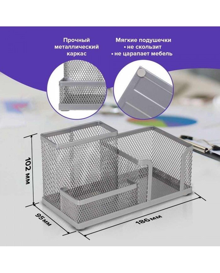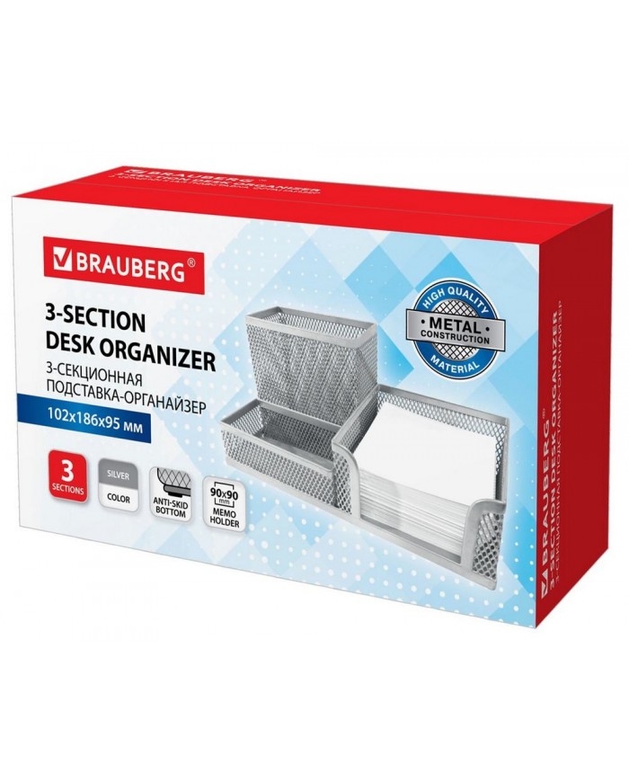 Подставка-органайзер BRAUBERG "Germanium", металлическая, 3 секции, 102*186*95 мм, серебристая,