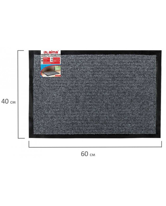 Коврик входной ворсовый влаго-грязезащитный 40х60 см, толщина 7 мм, ребристый, серый, LAIMA