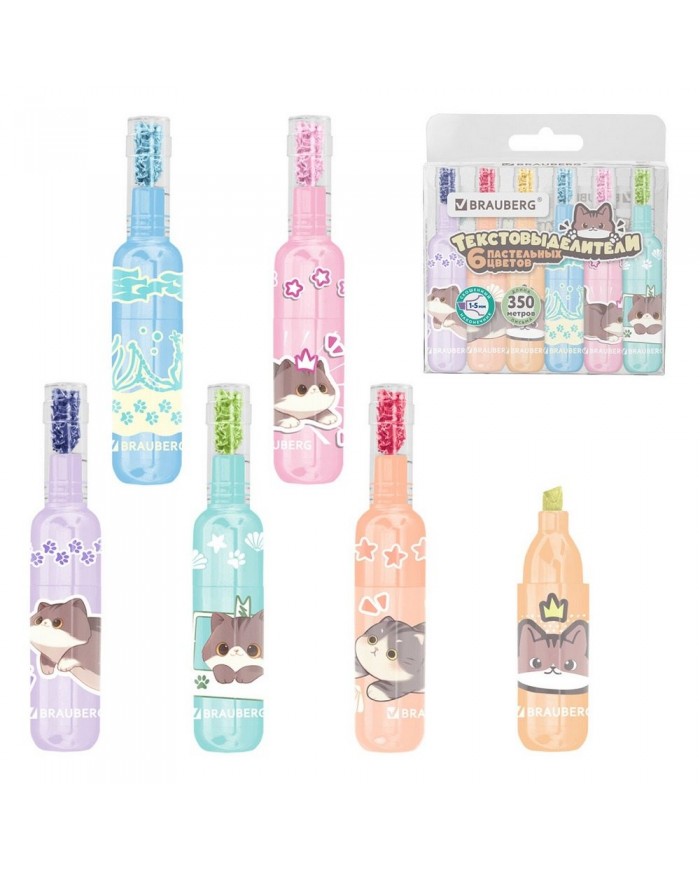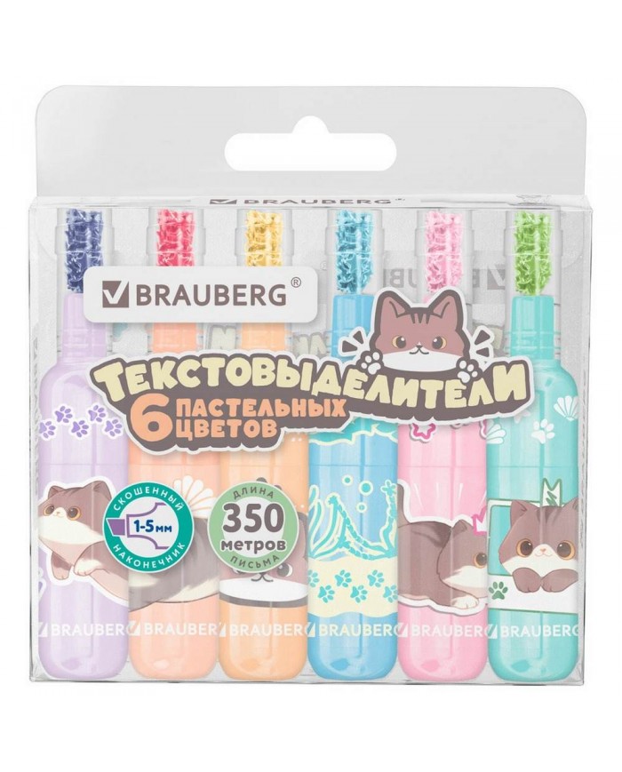 Набор текстовыделителей 6 ПАСТЕЛЬНЫХ ЦВЕТОВ, кросс-серия МИЛЫЕ КОТЫ, линия 1-5 мм, BRAUBERG,