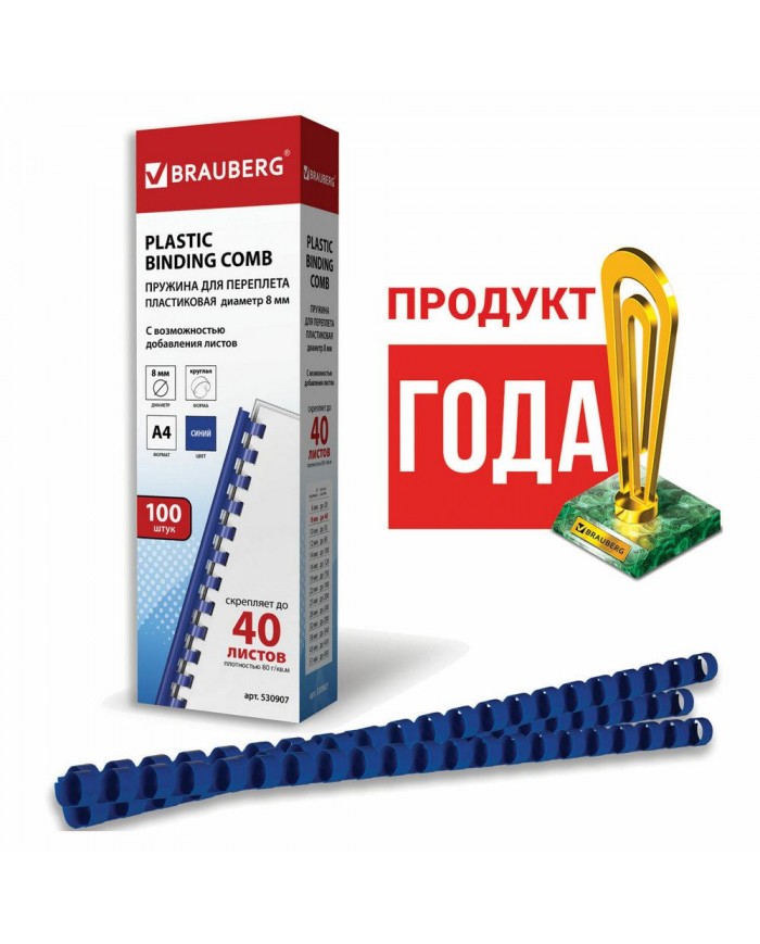 Пружины пластиковые для переплета, КОМПЛЕКТ 100 шт., 8 мм (для сшивания 21-40 л.), синие, BRAUBERG,