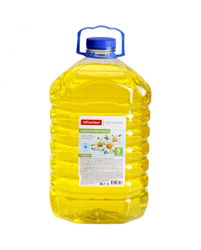 Мыло-крем жидкое OfficeClean Professional "Антибактериальное", с ромашкой, ПЭТ, 5л. Мыло обладает антибактериальными свойствами, приятным ароматом и пышной пеной. Эффективно очищает, увлажняет, придаёт мягкость коже рук. Специальные компоненты дополнительно питают кожу рук во время мытья. Состав: Вода очищенная, лауретсульфат натрия, хлорид натрия, диэтаноламид жирных кислот кокосового масла, кокамидопропилбетаин, парфюмерная композиция, триклозан, консервант (ДМДМ гидантоин, метилхлороизотиазо