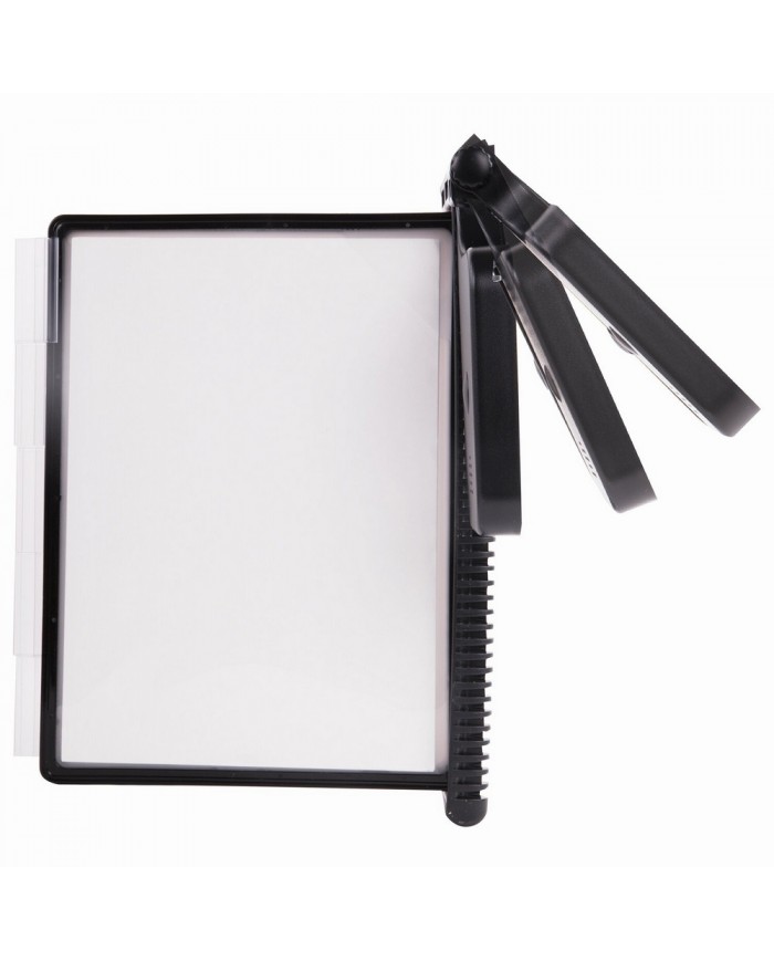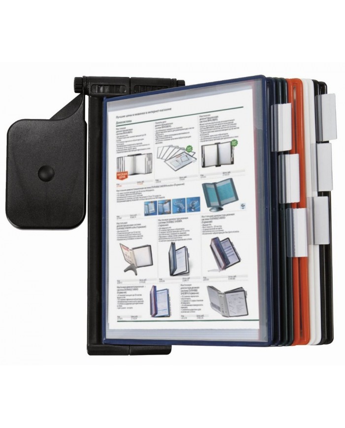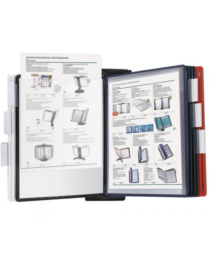 10 двухсторонних цветных панелей позволяют разместить одновременно до 20 листов формата А4. Прочные и гибкие литые рамки панелей изготовлены из полипропилена, пригодного для повторной переработки и дальнейшего использования. Демопанели оснащены съемными ярлычками-табуляторами для маркировки и удобного поиска нужной информации. Карман демопанели из прочного прозрачного материала с антибликовым покрытием надежно защитит документы от внешних воздействий. Система удобна в обращении благодаря регулируемуму наклону разсположения панелей. Имеет устойчивое утяжеленное основание. Винты для крепления демосистемы к стене поставляются в комплекте. Стильный черный цвет пластикового корпуса подойдёт для большинства современных интерьеров.
