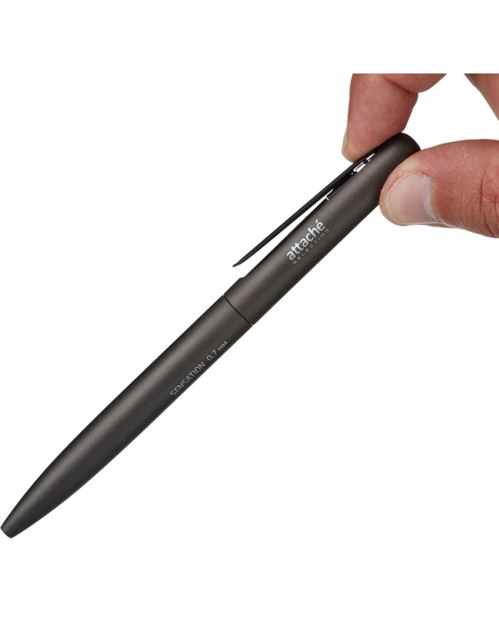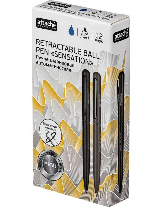 Ручка шариковая автоматическая Attache Selection Sensation — уникальный дизайн и непревзойденное качество. Модель имеет матовый алюминиевый корпус и оснащена поворотным механизмом. Стильный дизайн ручки дополняет металлическая выдвижная клипса, позволяющая плотно закрепить ручку в кармане или тетради для записей. Сменный стержень длиной 97.5 мм снабжён конусообразным наконечником и заправлен высококачественными масляными чернилами синего цвета. Диаметр пишущего узла 1 мм создает тонкую линию письма, равную 0.7 мм. Ручка обеспечивает лёгкое и мягкое письмо, яркие и насыщенные линии. Товар поставляется в нескольких варианта цвета (без возможности выбора). Благодаря качественным материалам, используемым при изготовлении, эта ручка станет надёжным помощником на долгое время.Внимание. Товар поставляется в нескольких цветовых решениях