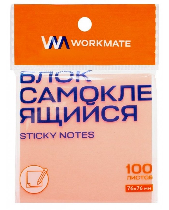 Бумага для заметок с липким краем 76х76 мм, неоново-розовый, 100 листов, Workmate