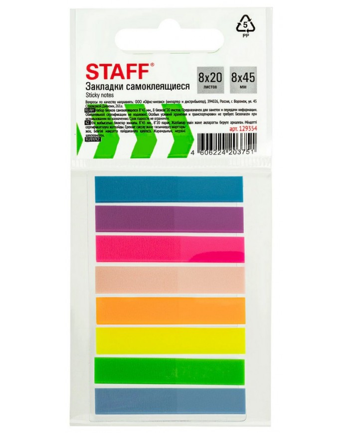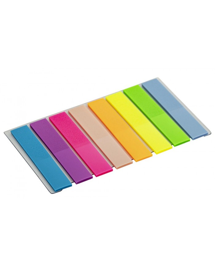 Набор пластиковых закладок 8 неоновых цветов размером 45х8 мм состоит из 160 листов, по 20 закладок каждого цвета. Клейкий слой - 22 Н/м. Легко клеятся к любой поверхности и не оставляют следов. Материал закладок позволяет делать надписи ручкой и карандашом. Уложены на пластиковом основании. Поставляются в полиэтиленовом пакете с европодвесом.