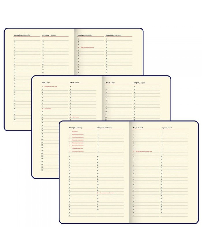 Внутренний блок включает 160 листов кремовой бумаги плотностью 70 г/м2. Благодаря стандартному формату А5 (143х210 мм) ежедневник удобно использовать как в офисе, так и на выездных деловых встречах. Твердая обложка стилизована под кожу с эффектом софт-тач, очень тактильную на ощупь. Ежедневник снабжен стильной магнитной застежкой, благодаря чему он не откроется в сумочке или портфеле, и листы не помнутся. Дополнением является закладка-ляссе, с помощью которой при необходимости можно быстро открыть нужную страницу, а также держатель для ручки, повышающий функциональность. Ежедневник содержит обширный справочный материал, а также 7 страниц для записей и заметок. Уголки – закругленные.