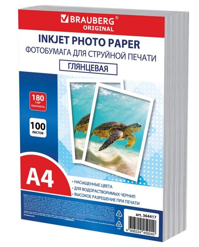 Фотобумага глянцевая, А4, 180 г/м2, односторонняя, 100 листов, ПАКЕТ, BRAUBERG ORIGINAL