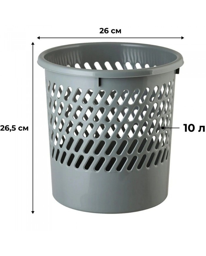 Корзина для мусора и бумаг Полимербыт 10 л пластик сетчатая (26.5?26?26 см)Сложно представить работу любого офиса без наличия большого количества документов и бумажной составляющей. Для утилизации ненужной бумаги используйте корзину для бумаги от Полимербыт.Изготовленная из высокопрочного качественного пластика, корзина ,имея компактные размеры и удобную форму, идеально помещается под рабочий стол. Классические цвета и универсальный дизайн делают изделие подходящим для любого типа помещений.Корзина очень лёгкая по весу, благодаря чему её без труда можно перенести с одного места на другое.Внимание! Товар поставляется в разных цветовых вариантах без возможности выбора!Внимание: в характеристике «Объем подходящего мешка» указан минимальный объем мешка, который подойдёт для изделия. Рекомендуется приобретать мешки указанного, либо большего объёма.