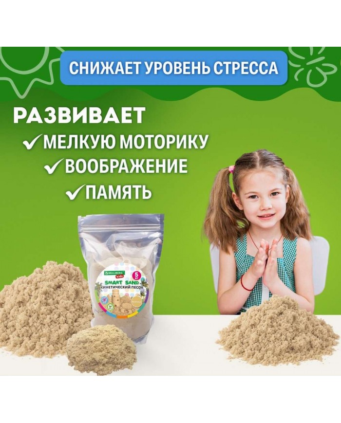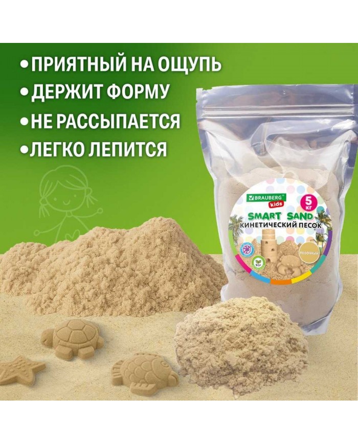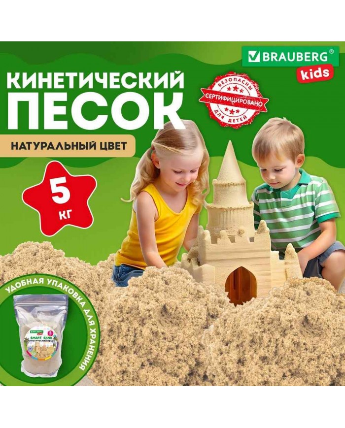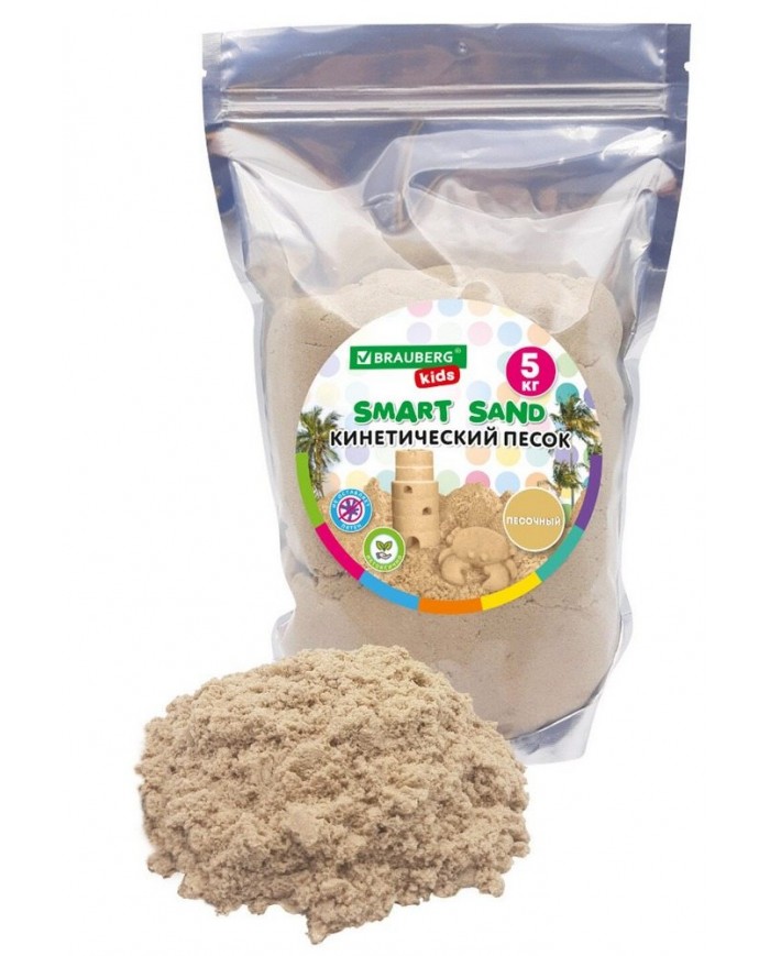 Безопасный кинетический песок BRAUBERG KIDS по текстуре похож на влажный морской песок, но вместе с этим он абсолютно сухой, приятный на ощупь, воздушный и мягкий, прекрасно сохраняет форму во время лепки. Состав набора: кинетический песок песочного цвета. Вес набора - 5000 г. Упакован в пакет дой-пак с замком zip-lock. Песок не только развивает детскую фантазию, но и обучает пониманию цвета и формы, не оставляет пятен, не засыхает, не рассыпается, не прилипает к рукам, легко собирается с поверх
