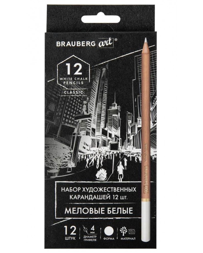 Карандаши МЕЛОВЫЕ художественные белые, НАБОР 12 шт., BRAUBERG ART CLASSIC, грифель 4 мм,