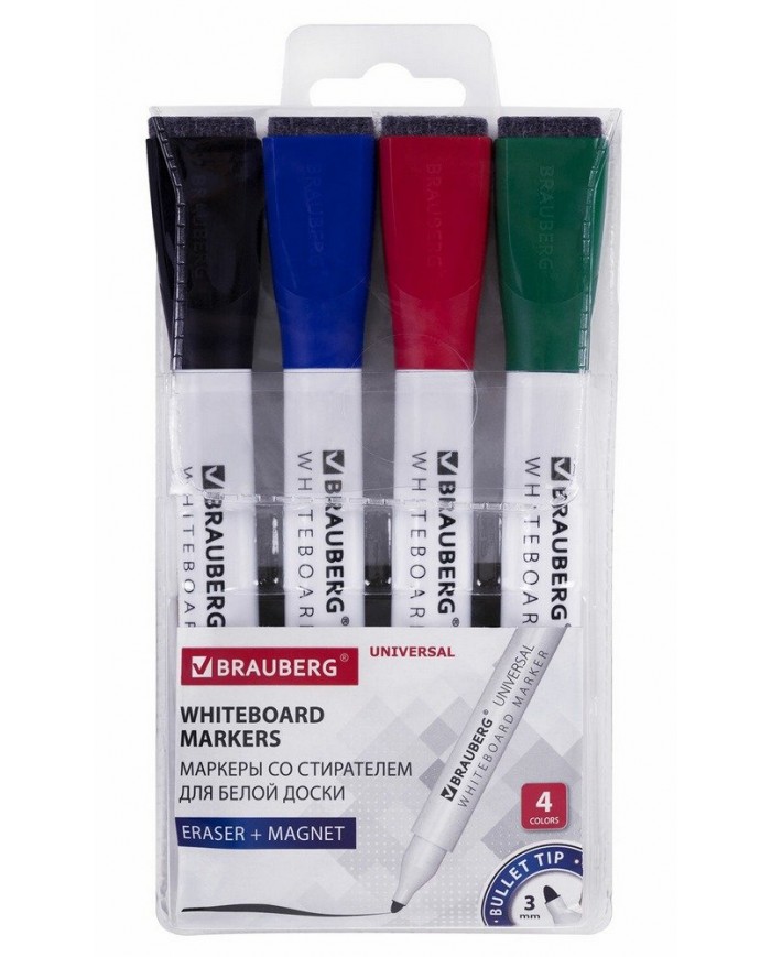 Маркеры стираемые на магните со стирателем для белой доски, 4 ЦВЕТА, BRAUBERG "UNIVERSAL", 3 мм,