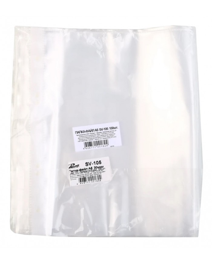 Файл-вкладыш формата А5 предназначен для хранения и защиты документов. Изготовлен из полипропиленовой пленки (толщина 30 мкм). Внешний размер: 171,5+2x216+2 мм, внутренний размер: 156+2x214 +2 мм. Имеет прозрачную глянцевую поверхность. Боковая универсальная перфорация подходит для разных типов скоросшивателей. В упаковке содержится 100 файлов. Каждый файл-вкладыш формата А5 вмещает до 40 листов стандартной плотности.