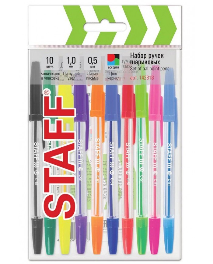 Ручки шариковые STAFF "C-51", НАБОР 10 шт., АССОРТИ, узел 1 мм, линия письма 0,5 мм,