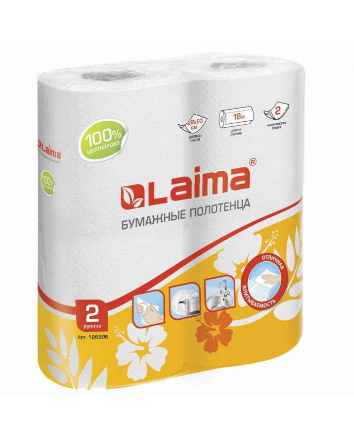 Полотенца бумажные бытовые, спайка 2 шт., 2-х слойные, (2х18 м), LAIMA, 22х23 см, белые,