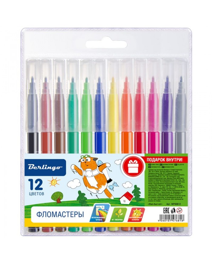 Фломастеры Berlingo серии «Жил-был кот» представлены с легкосмываемыми чернилами и вентилируемым прозрачным колпачком.Толщина линии составляет 2 мм, а длина линии письма - не менее 500 метров. В наборе 12 ярких цветов: красный, синий, зелёный, светло-зелёный, розовый, фиолетовый, светло-коричневый, коричневый, жёлтый, оранжевый, чёрный, серый. Корпус круглой формы изготовлен из полипропилена и имеет удобную круглую зону захвата. Тип наконечника – конический. Смываемые фломастеры на водной осно