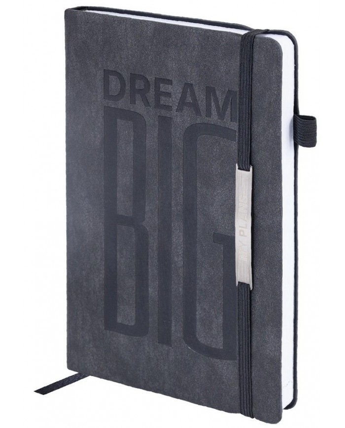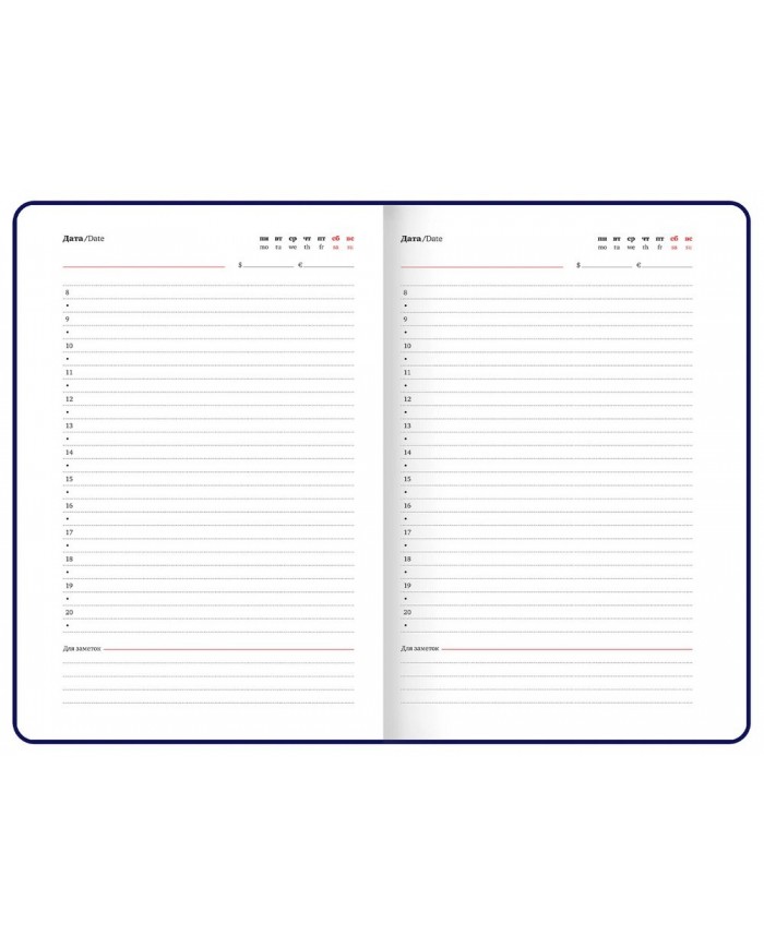 Внутренний блок включает 160 листов белой бумаги плотностью 70 г/м2. Каждая страничка имеет перфорированный угол. Благодаря стандартному формату А5 (138х213 мм) ежедневник удобно использовать как в офисе, так и на выездных деловых встречах. Гибкая обложка стилизована под текстурную кожу со стильным тиснением. Ежедневник снабжен резинкой-фиксатором с необычной металлической деталью, благодаря чему он не откроется в сумочке или портфеле, и листы не помнутся. Дополнением является закладка-ляссе, с