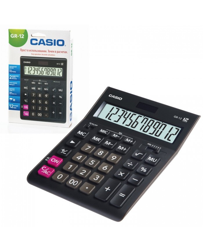 Калькулятор настольный CASIO GR-12-W (209х155 мм), 12 разрядов, двойное питание, черный, европодвес,