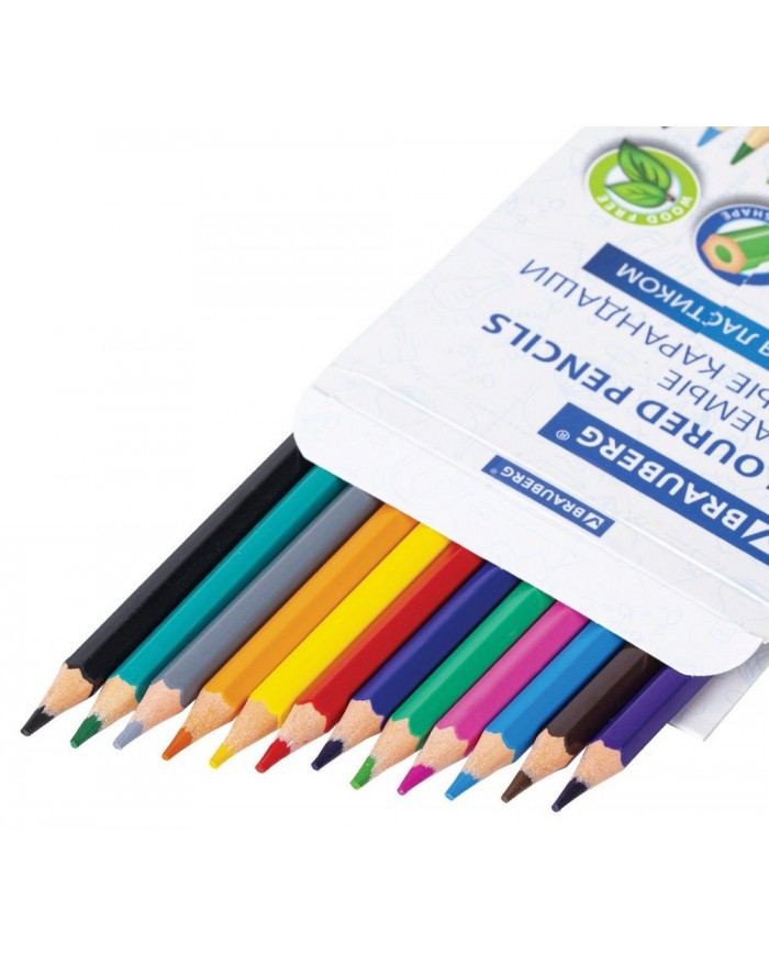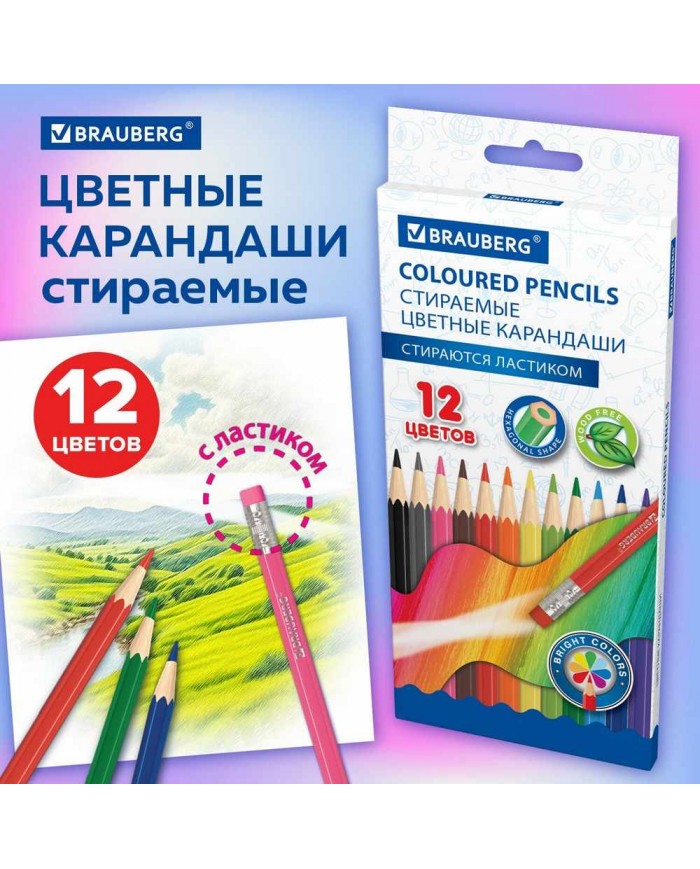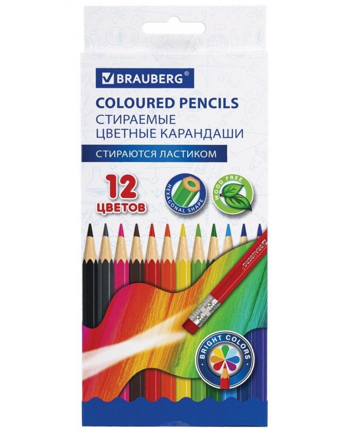 Набор состоит из 12 цветов: черный, синий, голубой, салатовый, зеленый, желтый, оранжевый, жёлтый, красный, розовый, фиолетовый, коричневый, серый. Рисуйте смело, не бойтесь экспериментов, ведь любой лишний штрих можно поправить с помощью ластика, закреплённого на корпусе. Рисуйте с удовольствием благодаря удобной шестигранной форме корпуса карандашей. Высококачественный пластик и качество исполнения гарантируют легкую заточку. Яркий лакированный корпус карандашей выполнен в цвет грифеля. Грифель диаметром 3 мм обладает повышенной прочностью, насыщенным цветом и мягкостью письма. Карандаши заточены и упакованы в качественную картонную коробку с европодвесом.