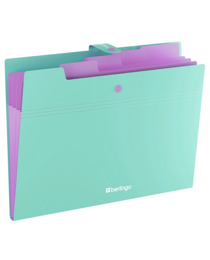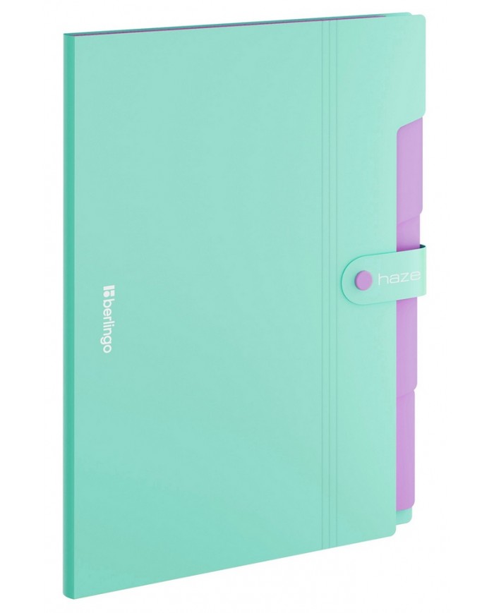 Папка пластиковая на кнопке с отделениями Berlingo "Haze" формата А4. Обложка с эффектом софт-тач. Цвет обложки - мятный. 5 внутренних отделений для удобного хранения и организации документов. Каждое отделение с индексным полем, позволяет сортировать документы по темам или алфавиту. Надежная застежка-кнопка. Контрастный фиолетовый цвет отделений. Быстрый доступ к содержимому. Изготовлена из высококачественного полипропилена с матовой текстурой поверхности софт тач. Предназначена для хранения и транспортировки документов. Толщина обложки 600мкм. Вмещает до 200 листов. Размер 245*325*10. Упакована в индивидуальный прозрачный пакет по форме.
