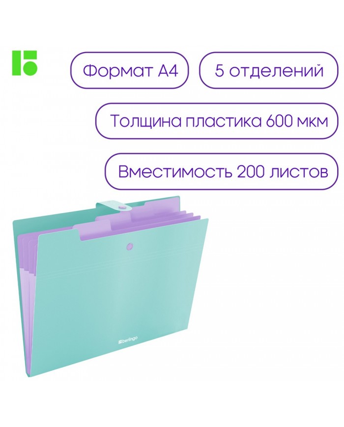 Папка 5 отделений Berlingo "Haze", А4, 600мкм, на кнопке, мятная, софт-тач