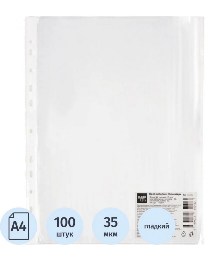Папка-вкладыш (файлы) А4 35 мкм Выбор есть Элементари, гладкий, с перф., 100шт/уп