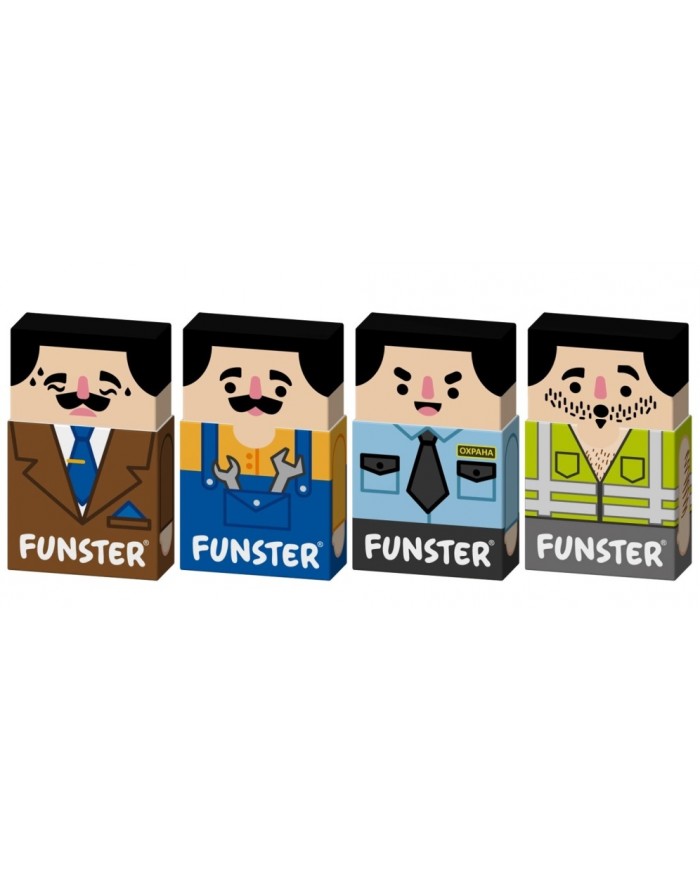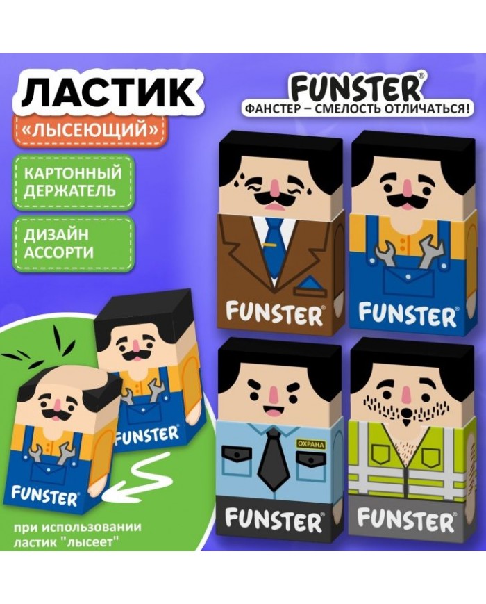 Ластик изготовлен из высококачественного мягкого ПВХ для идеального стирания. Идеальный размер – 50x30x12мм: удобно лежит в руке, не теряется на столе или в пенале. Ластик изображает представителя одной из четырёх профессий: трудоголик-директор, неутомимый сантехник, бдительный охранник, неунывающий рабочий. Каждый персонаж "одет" в свой фирменный картонный костюм-рукав – это и упаковка, и стильный держатель, который позволит сохранить ластик чистым. Верхний слой ластика, изображающий прическу персонажа, стирается при использовании. Чем больше вы работаете с ластиком, тем больше "лысеет" ваш герой. Ластик FUNSTER "ЛЫСЫЙ МЭН" – это идеальный, запоминающийся и небанальный подарок коллеге, другу, студенту или руководителю.