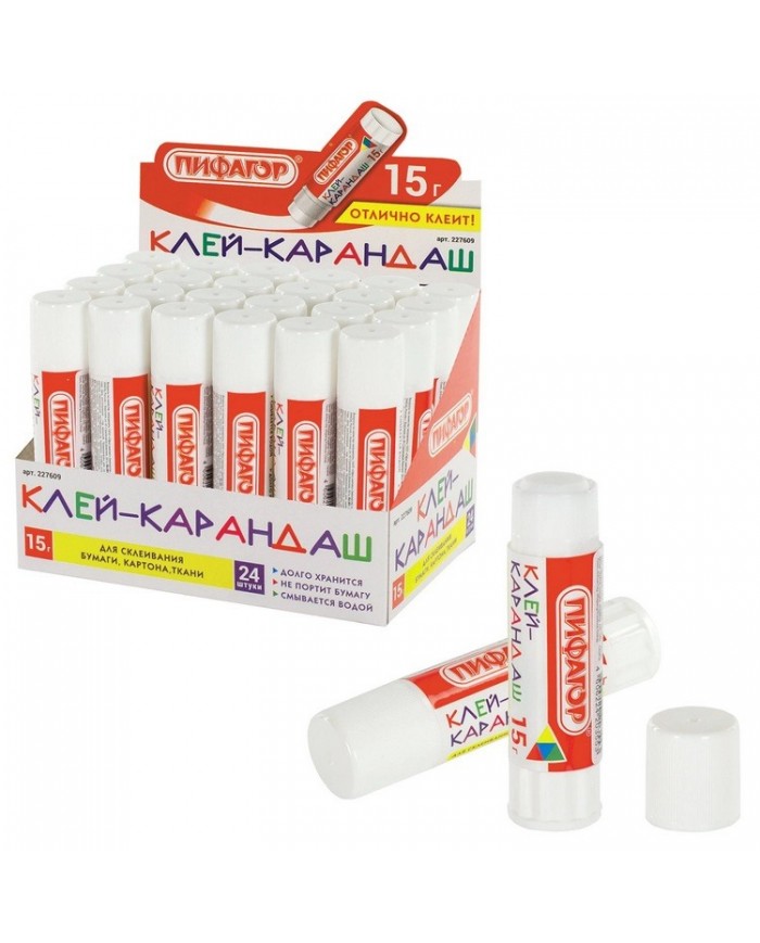 Объем - 15 г. Клей-карандаш ПИФАГОР легко наносится и распределяется по поверхности. Не токсичен и безопасен для здоровья. Клей-карандаш удобен в использовании: он не пачкает руки, стол, одежду; легко удаляется при помощи воды. Плотно прилегающий колпачок предотвращает высыхание клея.