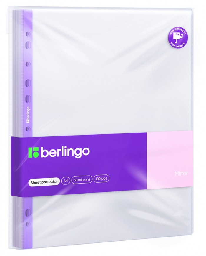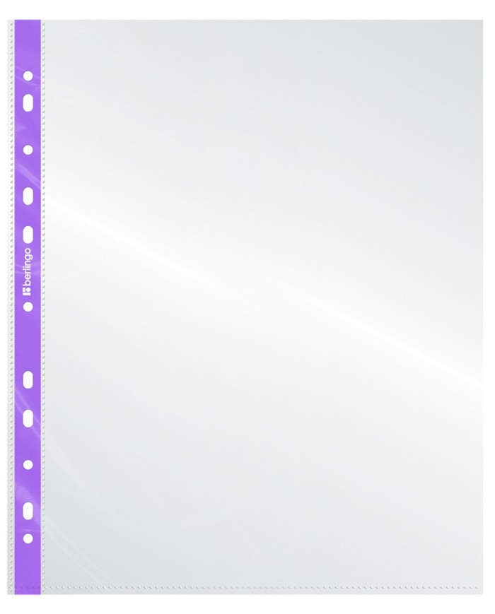 Глянцевые прозрачные файлы-вкладыши Berlingo "Mirror" формата А4 размера 305*235 мм предназначены для хранения неперфорированных документов в любых папках и защиты листов от внешних воздействий. Вертикальная ориентация, толщина пленки 50 мкм, вместимость файла от 50 до 100 листов бумаги, в зависимости от плотности. В упаковке 100 папок-вкладышей. Благодаря уникальной технологии производства, при которой используется до 40 % больше материала, достигается максимальная прочность каждого вкладыша. Белый логотип бренда на сиреневой боковой ленте.