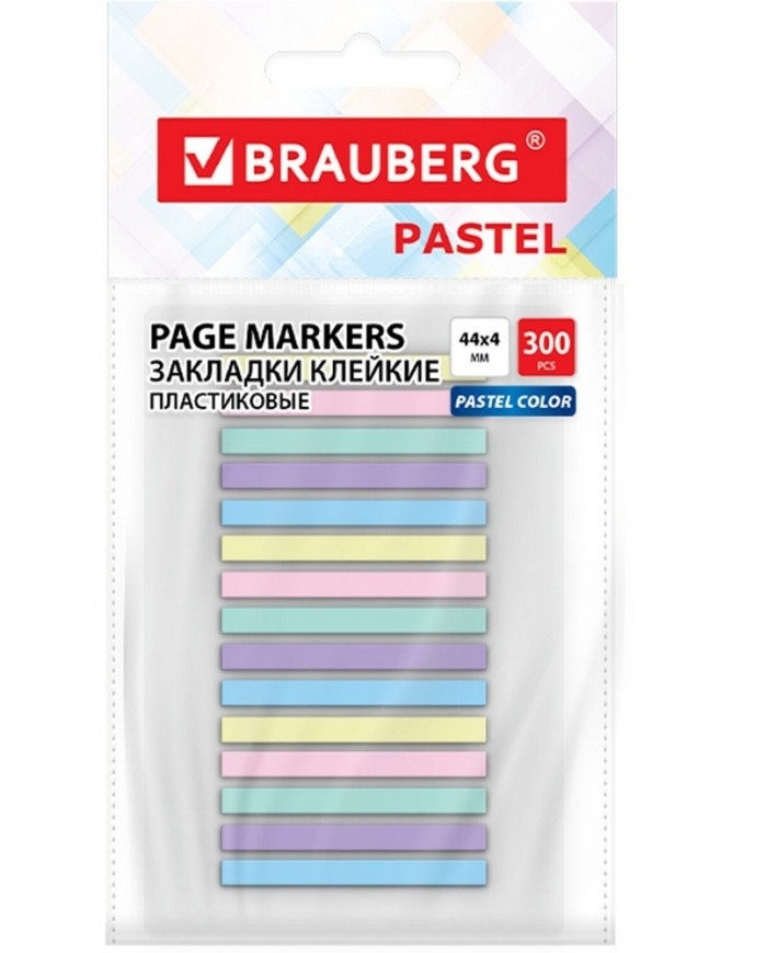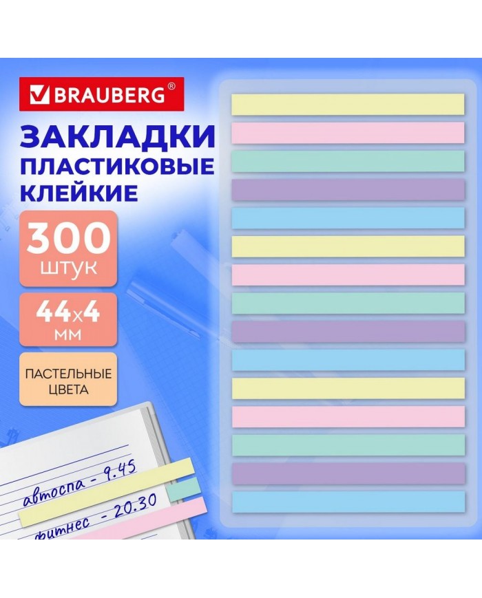 Набор пластиковых клейких закладок, 300 шт. Размер 44х4 мм, 5 пастельных цветов. Закладки закреплены на подложке: 15 блоков, в каждом по 20 закладок.. Легко клеятся к любой поверхности и не оставляют следов. Материал закладок позволяет делать надписи ручкой и карандашом. Уложены на пластиковом основании. Поставляются в полиэтиленовом пакете с европодвесом.