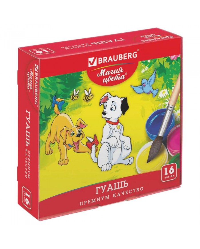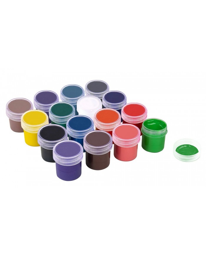 В наборе 16 ярких и насыщенных цветов: белый, красный, черный, синий, желтый, зеленый, коричневый, оранжевый, фиолетовый, светло-зеленый, голубой, розовый, красно-коричневый, охра, кармин, темно-зеленый. Краски полностью безопасны в использовании, не токсичны и не имеют резкого запаха. Гуашь обладает высокой светостойкостью и укрывистостью, легко размывается водой, хорошо наносится и быстро сохнет, без труда удаляется с рук и одежды. Краска находится в пластмассовой герметичной баночке, объем которой равен 20 мл. Общий объем – 320 мл. Ребенок сможет легко открыть баночки с винтовыми крышками без помощи взрослых.