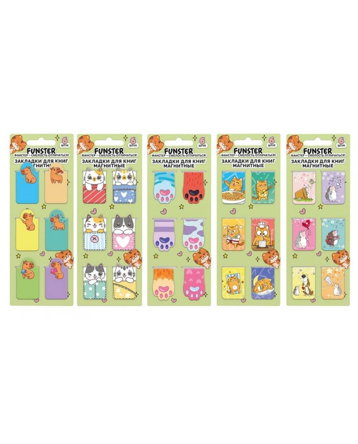 Закладки для книг МАГНИТНЫЕ, "АССОРТИ 5 ДИЗАЙНОВ ЗВЕРЯТА", 6 штук, 35x25 мм, FUNSTER (ФАНСТЕР),