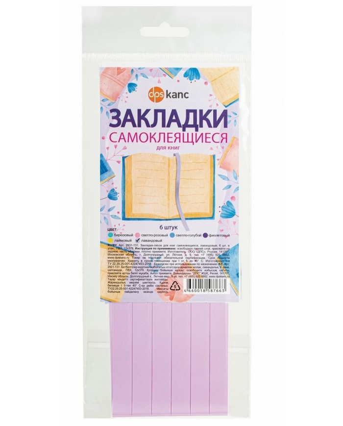 Закладки для книг САМОКЛЕЯЩИЕСЯ, КОМПЛЕКТ 6 шт., лавандовый, ДПС,