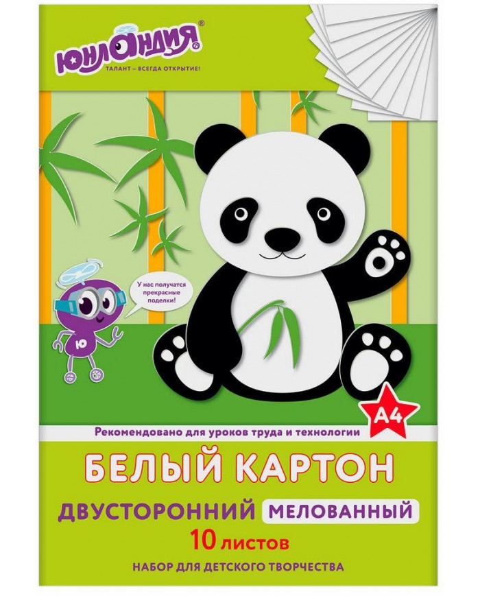 Мелованный картон обладает плотностью 200 г/м2, имеет гладкую, идеально белую (глянцевую) поверхность с одной стороны и белую матовую поверхность с оборота. Его можно использовать как для поделок, так и для рисования, а также в качестве основы для аппликаций. С помощью этого картона ребенок сможет воплотить в жизнь любую творческую задумку. В наборе 10 листов двустороннего картона белого цвета формата А4 (200х290 мм). Творческая инструкция по созданию аппликации на обороте.
