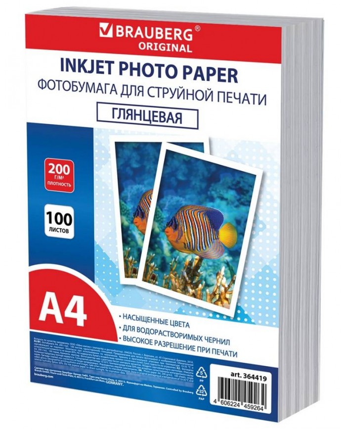 Фотобумага глянцевая, А4, 200 г/м2, односторонняя, 100 листов, ПАКЕТ, BRAUBERG ORIGINAL,