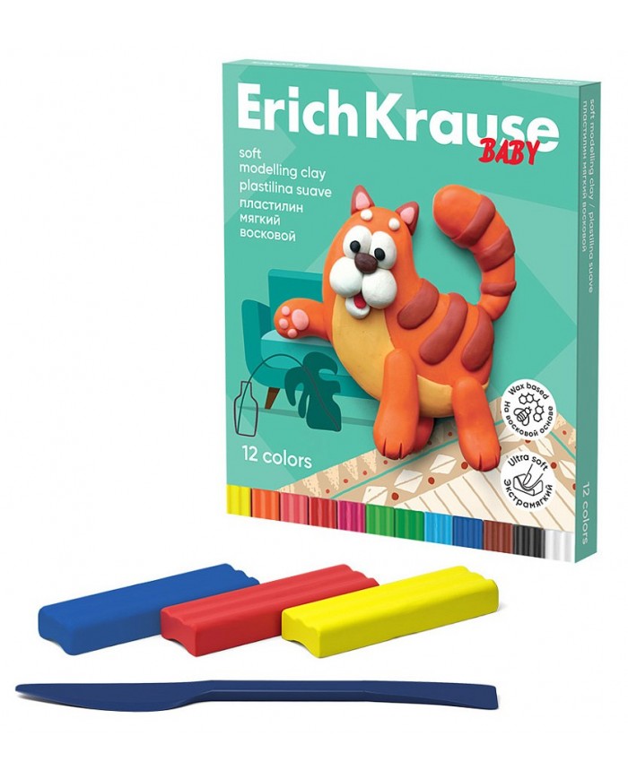 Пластилин мягкий восковой ErichKrause Baby 12 цветов со стеком, 156 г