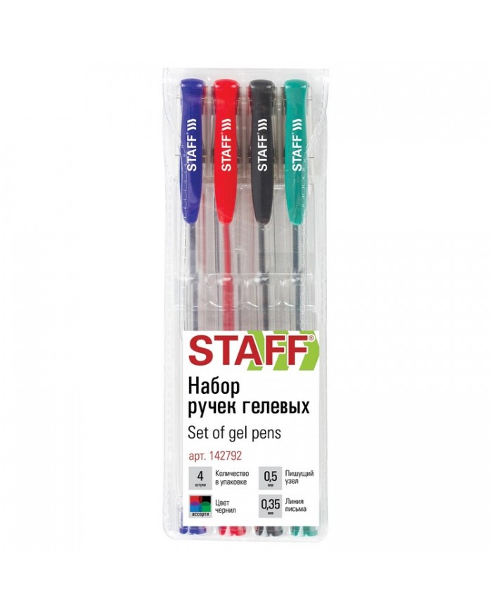 Ручки гелевые STAFF "Basic", НАБОР 4 шт., АССОРТИ, хромированные детали, узел 0,5 мм, линия письма 0
