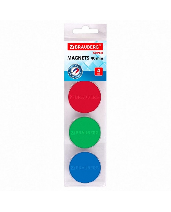 Магниты МОЩНЫЕ 40 мм (БОЛЬШОГО ДИАМЕТРА), НАБОР 4 шт., ассорти, BRAUBERG "SUPER"