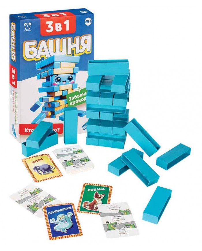 В одной коробке 3 увлекательные игры. "Башня" – всемирно известная игра, в которой игрокам предстоит собирать башню, переставляя брусочки с уровня на уровень. "Забавный крокодил" – игра на объяснение слов при помощи жестов, помогающая развивать словарный запас и весело проводить время в дружеской или семейной компании. "Кто есть кто?" – весёлая игра, в которой вам необходимо угадать, кто изображён на вашей карточке. Состав игры: пластиковые брусочки – 30 шт., игровые карточки – 25 шт., правила.