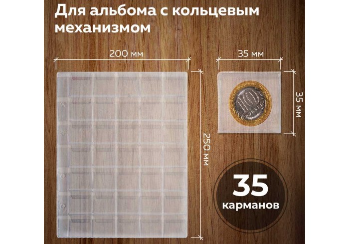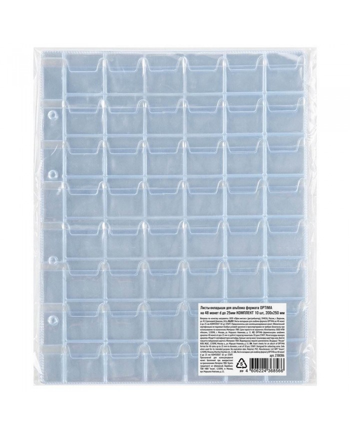 Листы-вкладыши для альбома размером 200х250 мм выполнены из качественного ПВХ. В комплект входят 10 листов. Всего листы вмещают 480 монет. Размер одно..