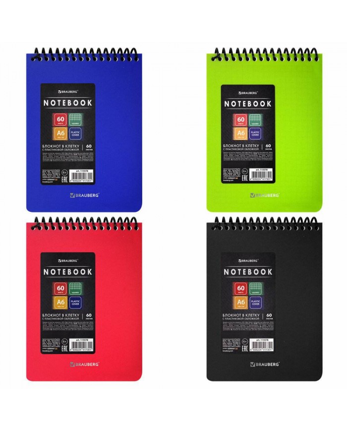 Блокнот формата А6 на спирали содержит 60 листов с линовкой в клетку, что позволяет зафиксировать всю необходимую информацию. Малый формат удобно поместить в кейс или сумку малых габаритов. Имеет верхнее расположение переплета. Обложка выполнена из пластика, что делает блокнот более износоустойчивым. Внутренний блок состоит из белой офсетной бумаги плотностью 70 г/м2. ПОСТАВЛЯЕТСЯ В НЕСКОЛЬКИХ ВАРИАНТАХ ЦВЕТА (БЕЗ ВОЗМОЖНОСТИ ВЫБОРА).