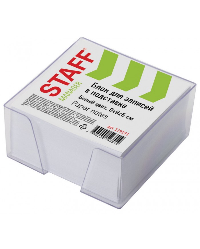 Блок высотой 5 см сложен из квадратных листов размером 9 х 9 см. Листы изготовлены из высококачественной офсетной бумаги плотностью 60 г/м2 и белизной 90-92%. Блок для записей подходит для письма любыми типами ручек и карандашей, листы благодаря высокой плотности не продавливаются при нажатии. Поставляется в плотной термоусадочной пленке, защищающей при транспортировке. Когда бумага закончится, можно вставить сменный блок.