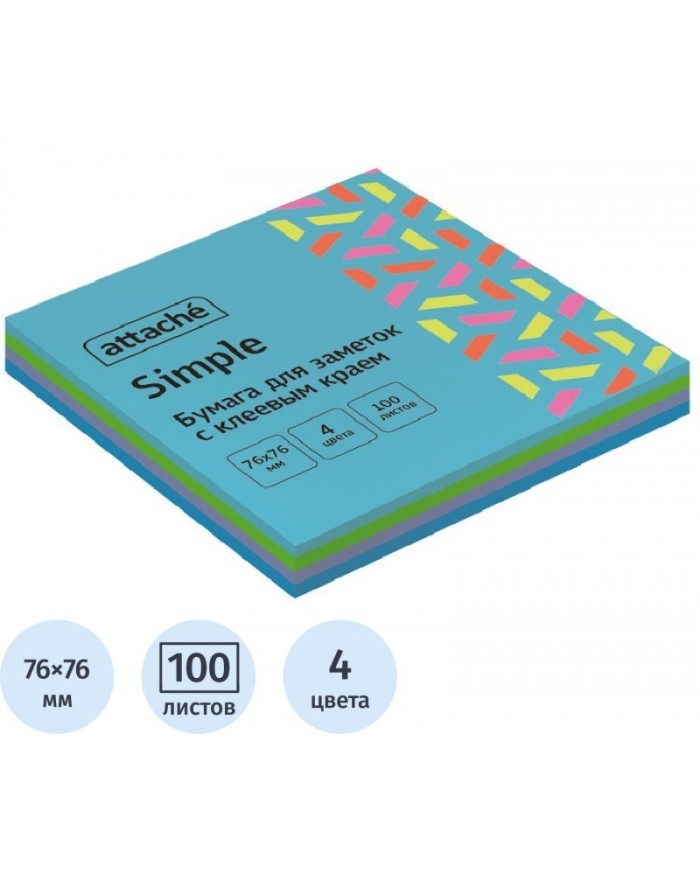 Стикеры Attache Simple Акварельная радуга в формате 76x76 мм, 4 цвета.Идеально подойдут для сотрудников творческих профессий и руководителей: рекомендуются для использования в процессе совещаний, обучения, мозговых штурмов. Тон стикеров - неоновый. Плотность бумаги составляет 62 г/кв.м, клейкий слой - 16 Н/м. В упаковке 100 листов, в блистере. Длина клейкой стороны 76 мм. После удаления бумаги на поверхности не остается следов клеевого состава, лист можно крепить повторно. Особых условий хранения не требует, сертификации не подлежит, срок годности не ограничен.Чтобы увеличить срок службы стикеров, пожалуйста, следуйте рекомендациям:1) Отделять стикер от блока следует вдоль клеевой полосы. Так можно избежать скручивания и последующего отклеивания стикера.2) Прежде чем наклеивать стикер, убедитесь в отсутствии грязи и пыли на поверхности. На чистой поверхности срок службы клеевого слоя более продолжителен.Законодательные и технические документы: