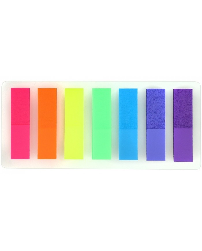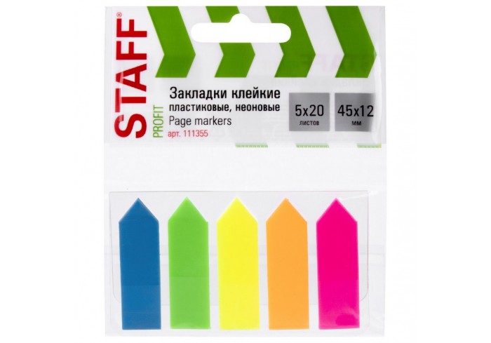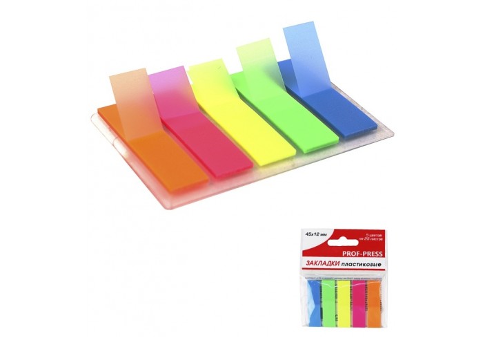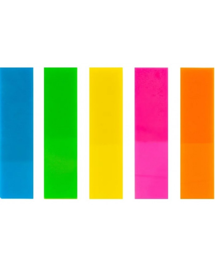 Набор пластиковых закладок 5 неоновых цветов размером 45х12 мм состоит из 100 листов, по 20 закладок каждого цвета. Клейкий слой - 22 Н/м. Легко клеят..