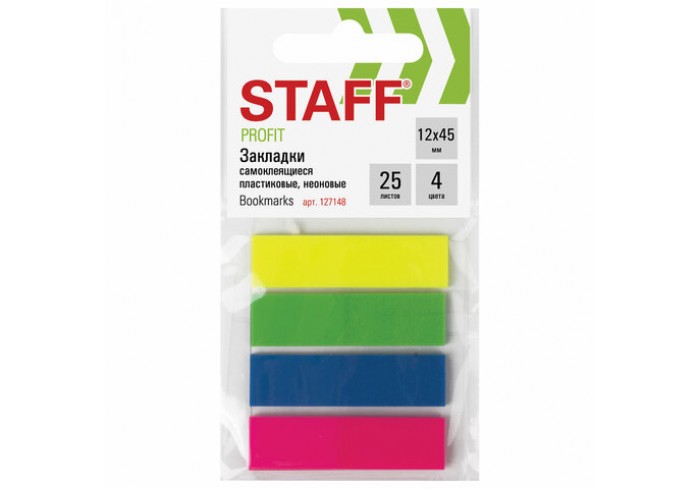 Набор пластиковых закладок 4 неоновых цветов размером 45х12 мм состоит из 100 листов, по 25 закладок каждого цвета. Клейкий слой - 22 Н/м. Легко клеят..