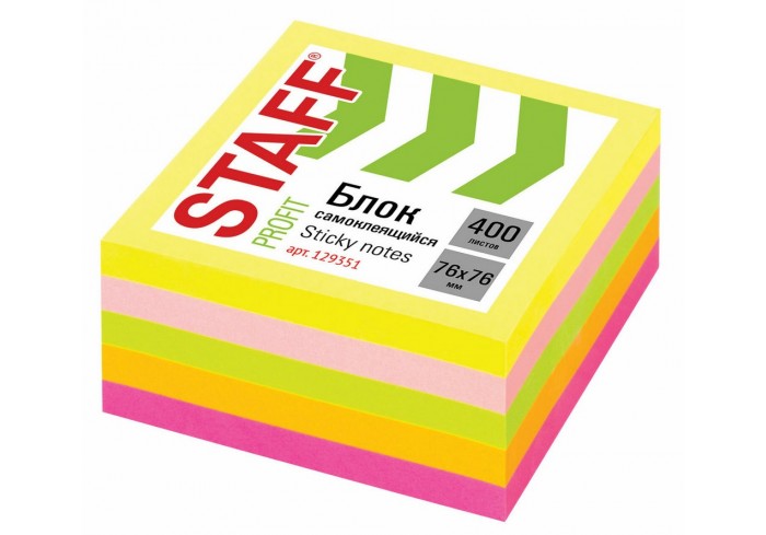 Стикеры 5 неоновых цветов (желтый, розовый, зелёный, оранжевый, малиновый) в форме куба 76х76 мм состоят из 400 листов. Плотность бумаги составляет 75..